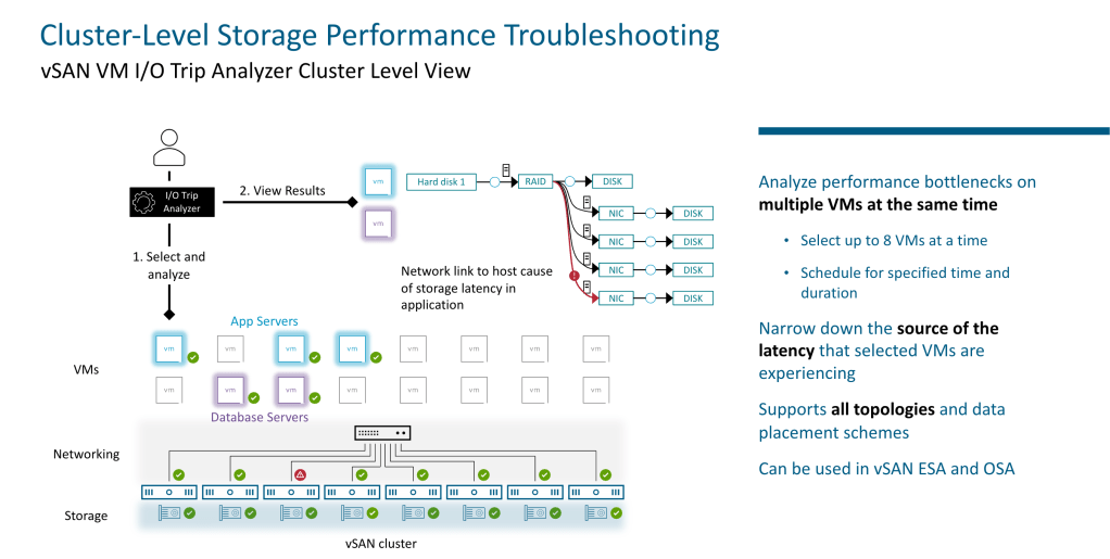 So the great thing about vSAN is that no longer do I as admin have to wait on the storage team to give me a LUN or an NFS mount if I need more storage or some other change. It’s under my control as part of VCF. The downside, of course, is that when something isn’t performing as needed I’ve also got the responsibility of fixing it. With vSAN 8 U3 which is part of VCF 5.2 I’m able now to measure performance of multiple virtual machines at the same time. This means I can take a full application (up to 8 virtual machines) and do an I/O analysis and find exactly what an where the performance bottleneck is occurring. Or, be able to show it’s not the infrastructure but somewhere else. Really cool stuff and super useful.